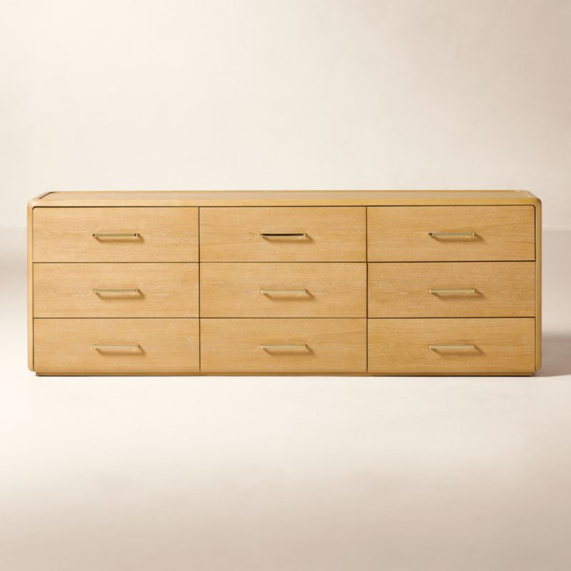 Crafted with FSC ®-certified solid and veneered oak, dresser by Brooklyn-based designer Caleb Zipperer pairs clean lines with gently rounded corners. Spacious drawers are accented by solid brass pulls with an antique bronze finish to complement the wood's light brown stain. Set on a recessed plinth base, dresser is finished with a light wirebrushing that lets the natural grain pattern shine. CB2 exclusive.