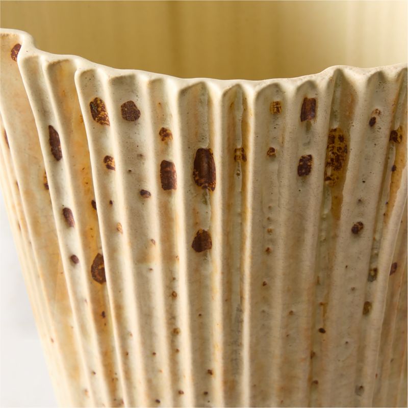Stunning Italian vase makes a statement when displayed on the credenza or console table. Continuing the traditions of midcentury Italian ceramicist Alvino Bagni, skilled artisans at Nuove Forme in Florence, Italy throw each vase by hand, finishing the fluted body with a glossy white reactive glaze. Marked by an abstract pattern of rust reds and yellows in the glaze, the vase is ideal for a bouquet of dried botanicals. CB2 exclusive.