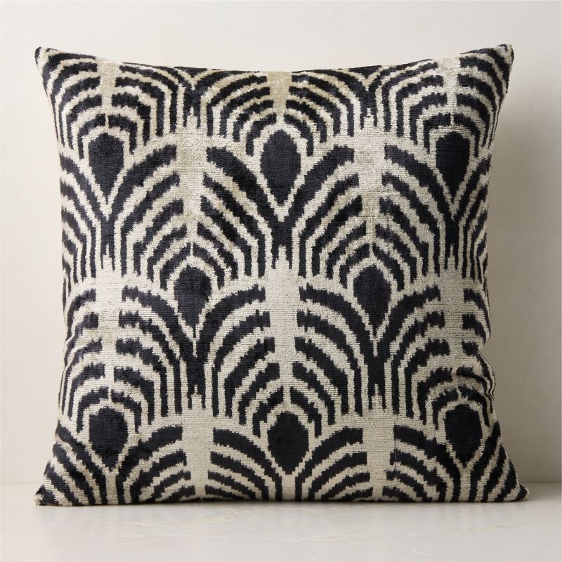 Woven by hand using traditional methods, throw pillow merges Ottoman and Central Asian influences with a contemporary sensibility. The bold geometric motif, rendered in a striking ivory-and-black palette, is crafted from a silk-blend fabric that catches the light with subtle sheen. Richly textured and velvety to the touch, each piece is hand-dyed and one-of-a-kind, with natural variations in color and weave that reflect its artisanal origin. Finished with a knife edge, pillow reverses to a solid cotton-linen back for effortless styling. CB2 pillows include a pillow insert in your choice of feather down or down alternative. CB2 exclusive.
