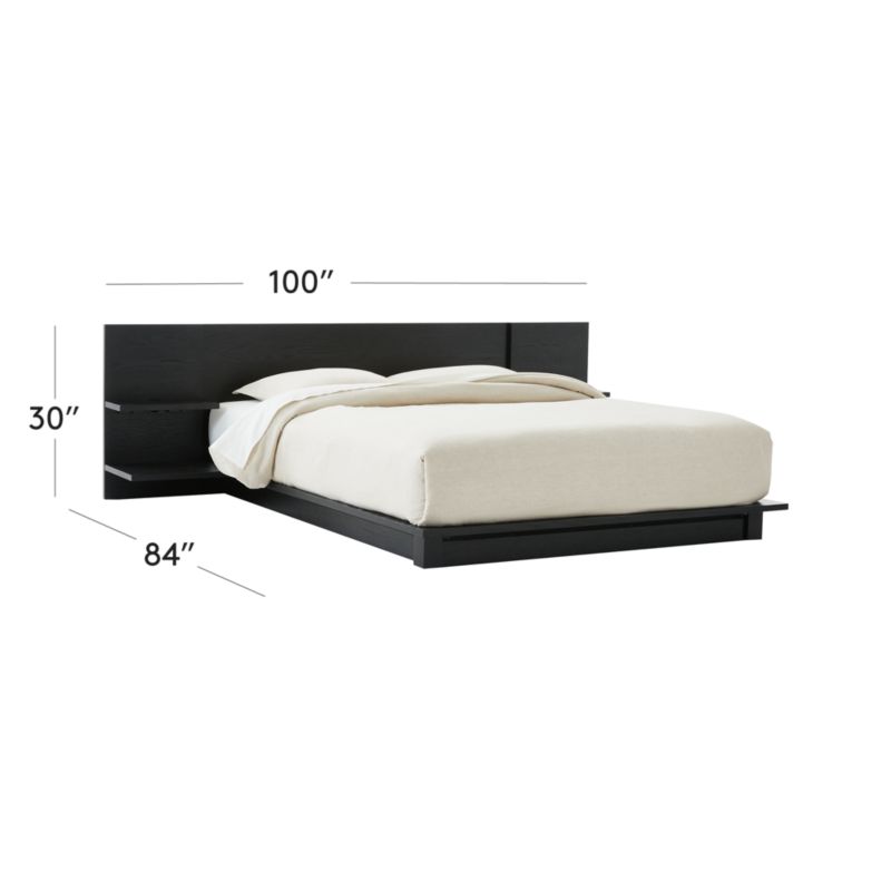 Modern platform bed from designer Mark Daniel of Slate Design imbues minimalist form with the richness of ebonized American white oak. The spare silhouette integrates headboard nightstands with two cantilevered shelves each—one wide for books, one narrow with discreet cord cutouts for your light/phone/alarm clock. Ledge extends around mattress and hovers over corner block feet. Headboard is just the right height for pillow propping, too. CB2 exclusive.