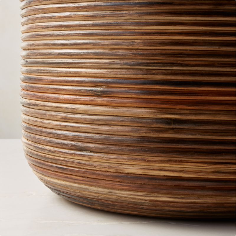 Rattan coils into basket form and becomes a natural showcase for any treasured houseplant. Rich burnt finish adds warmth and character; hidden tin liner is watertight. Make it a trio with the small and medium planters. CB2 exclusive.