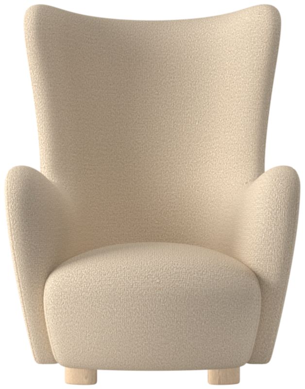 A modern take on a classic wing chair. Designer Ross Cassidy brings his signature flair to a popular silhouette by wrapping it entirely in luxe ivory boucle. Bleached oak feet are asymmetrical and wire-brushed for a special design detail, with matching asymmetrical ottoman sold separately. Framed out in FSC ®-certified wood. CB2 exclusive.