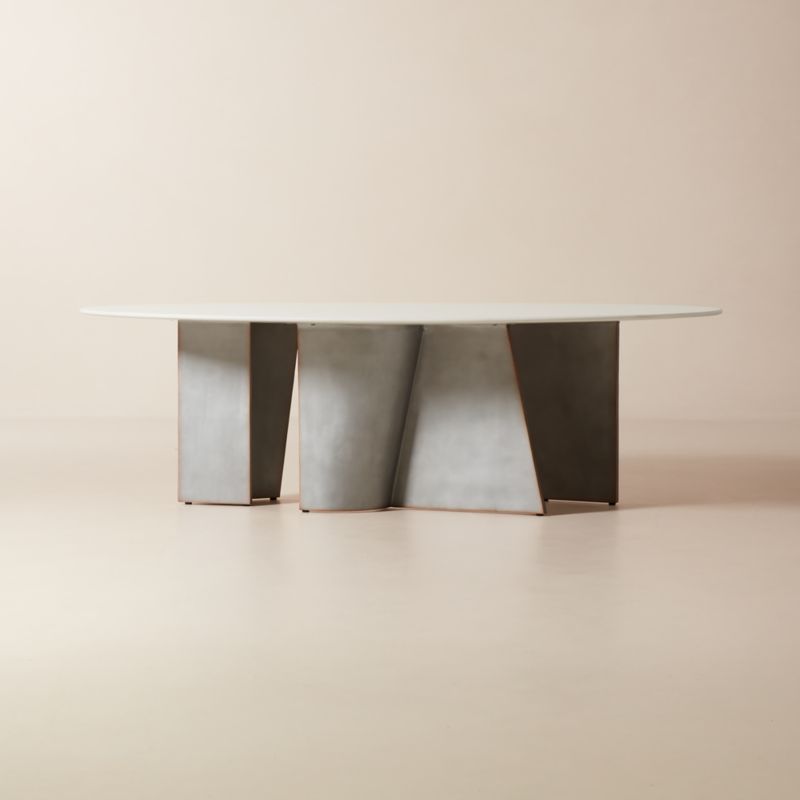 goop highlights the refined materiality of cast aluminum and milky white resin. A modern interpretation of Brutalist design, satin cast aluminum legs are accented with a pale copper finish on the edges that evokes the soft patina of oxidized metal. The legs meet at unexpected angles, bringing new energy to the piece from every angle. Evoking the signature style of goop, the resin top is coated in a contrasting soft white hue for a feminine finish. CB2 exclusive.