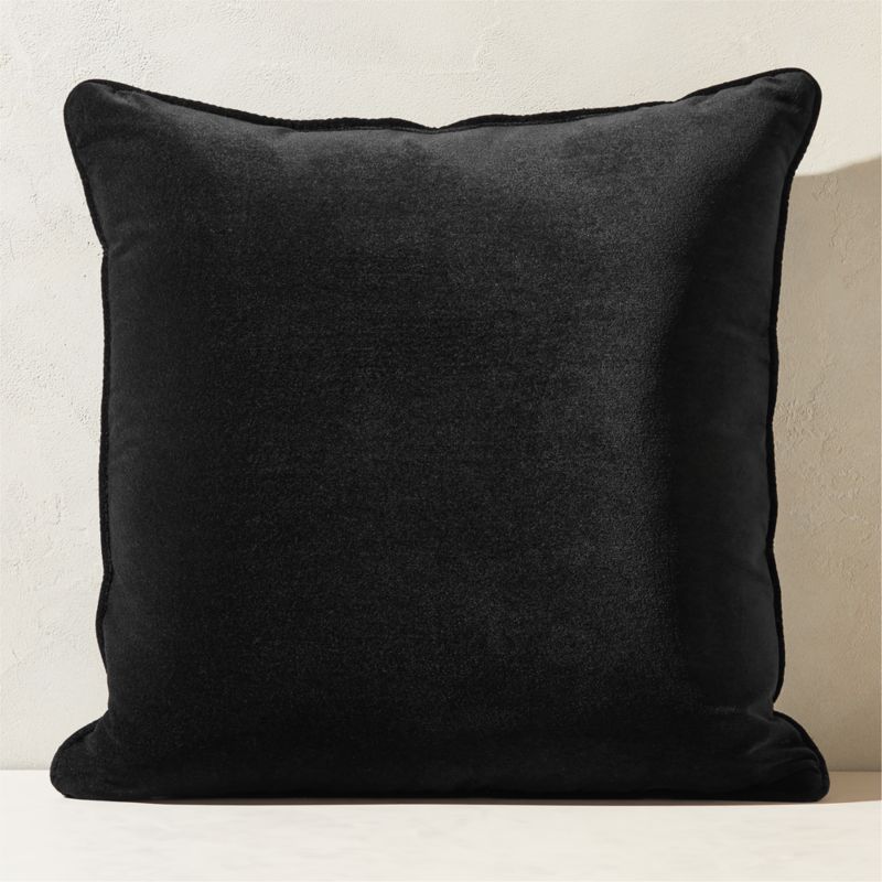 Black velvet throw pillow brings the rich texture and appeal of indoor textiles to the outdoors. Innovative recycled velvet is soft to the touch and durable against the elements. Sleek black piping lends an elevated finish. CB2 exclusive.