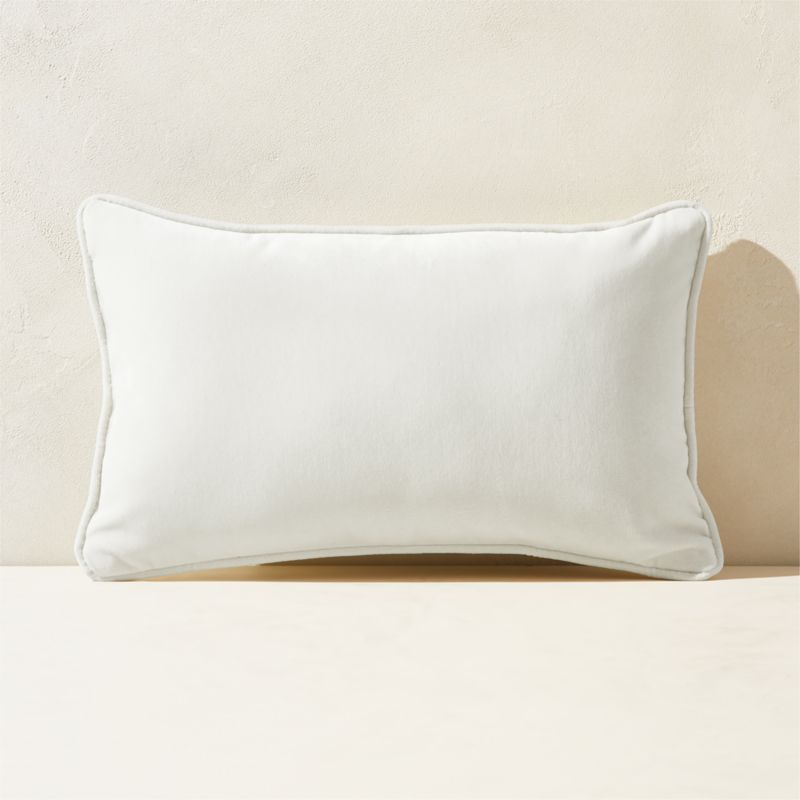 Warm white velvet throw pillow brings the rich texture and appeal of indoor textiles to the outdoors. Innovative recycled velvet is soft to the touch and durable against the elements. Tonal piping lends an elevated finish. CB2 exclusive.