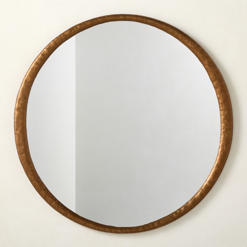 Round wall mirror from French industrial designer Aurélien Barbry is framed in sand-cast metal for a look that sits somewhere between heirloom and industrial. The tonal dark bronze finish highlights the frame's sophisticated texture and subtle organic shape that draws the eye inward. CB2 exclusive.
