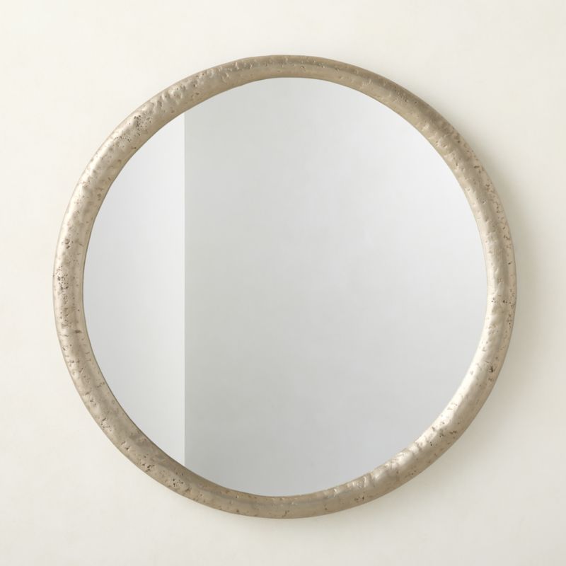 Round wall mirror from French industrial designer Aurélien Barbry is framed in sand-cast metal for a look that sits somewhere between heirloom and industrial. The tonal nickel finish is unlacquered, which will develop the patina of a vintage find. If desired, simply polish the frame to restore its original luster. CB2 exclusive.