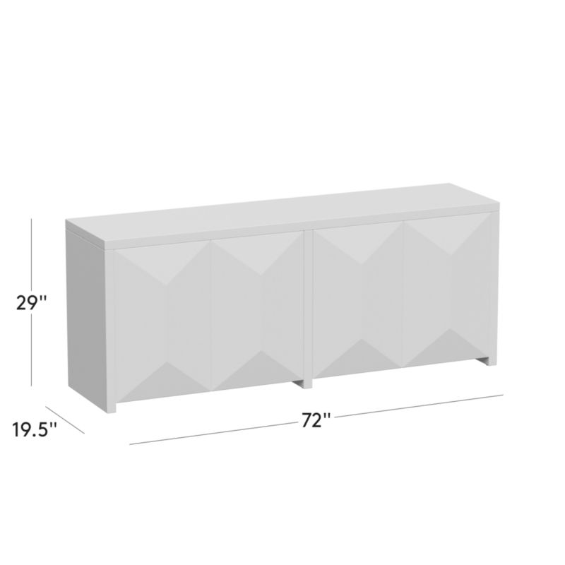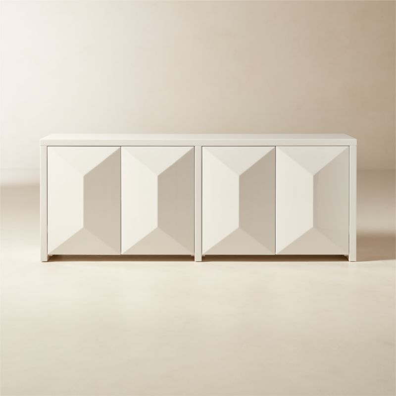 High-gloss ivory credenza by NYC-based designer Brett Beldock takes inspiration from the sculptural designs of Brutalism. The faceted front brings rich dimension to the design while cleverly concealing four push-to-open doors. Finished in a creamy white high-gloss lacquer that feels fresh while adding a touch of warmth to the space. CB2 exclusive.