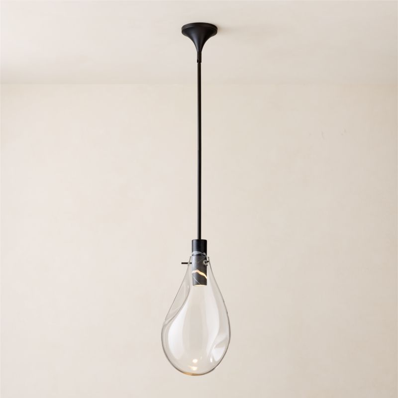Designed by Farrah Sit, pendant light gleams overhead with an elegant mixed-material look. Encased by a blown-glass shade, the pendant is suspended from a slim, polished blackened brass rod, giving the appearance that the fixture is floating from the ceiling. Housed within Marquina black marble, the bulb emits a warm glow that highlights the beauty of the stone. CB2 exclusive.