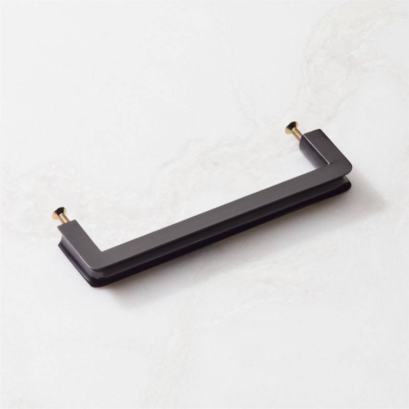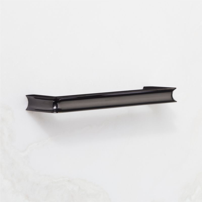 Finished in plated matte black, solid brass is sculpted into an edgy handle. The mix of shiny and matte finishes elevates doors and drawers, adding unexpected depth and texture. Pairs with the Calix finger pulls for a cohesive look. CB2 exclusive.