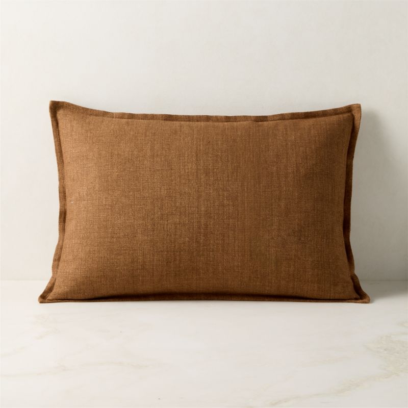 Crafted from 100% flax linen, tawny brown throw pillow reveals the quiet artistry of délavé garment dyeing—a technique that oxidizes pigment to achieve soft tonal variations and a subtle melange effect. The result is a gently textured surface that feels refined and relaxed. Naturally breathable linen offers a lightweight hand that becomes even softer over time. Finished with a flange edge, this reversible design styles effortlessly in any space. Each piece is uniquely one-of-a-kind, bearing the beautiful nuance of its artisanal dyeing process. CB2 pillows include a pillow insert in your choice of feather down or down alternative. CB2 exclusive.