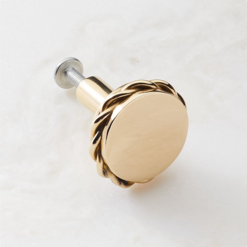 Studio Anansi, twisted brass knob brings a touch of vintage luxury to any door or drawer. Inspired by the look of rope, solid brass delicately twists around the polished knob for added interest. Constructed of aged unlacquered brass, the knob has a worn, antique look that will patina beautifully over time. Pairs with the Carrick handles and wall mirrors for a cohesive look. CB2 exclusive.