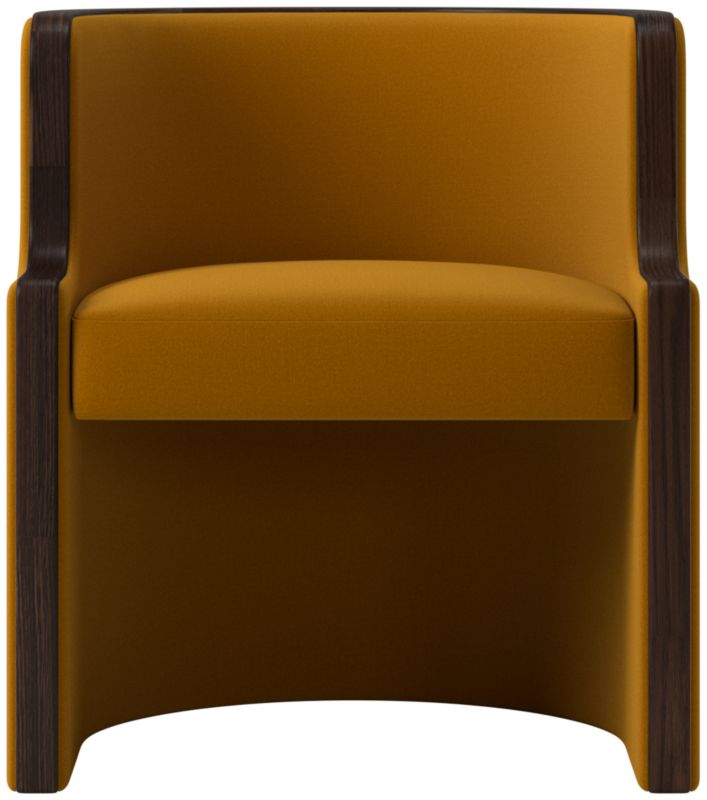 Classic-meets-contemporary barrel chair by Brett Beldock is wrapped in fabric and outlined by a thick band of solid American red oak certified sustainable by the Forest Stewardship Council ®. Makes a bold statement as an end chair or can be used as a side chair. CB2 exclusive.