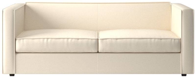 Sheltering club sofa turns tradition on its edge. Compact two-seater sofa to the nines with exaggerated flange that outlines boxy design. Love the impromptu feel of the intentional seat cushion overhang and super comfy back that curves to relax/support just where you need it.