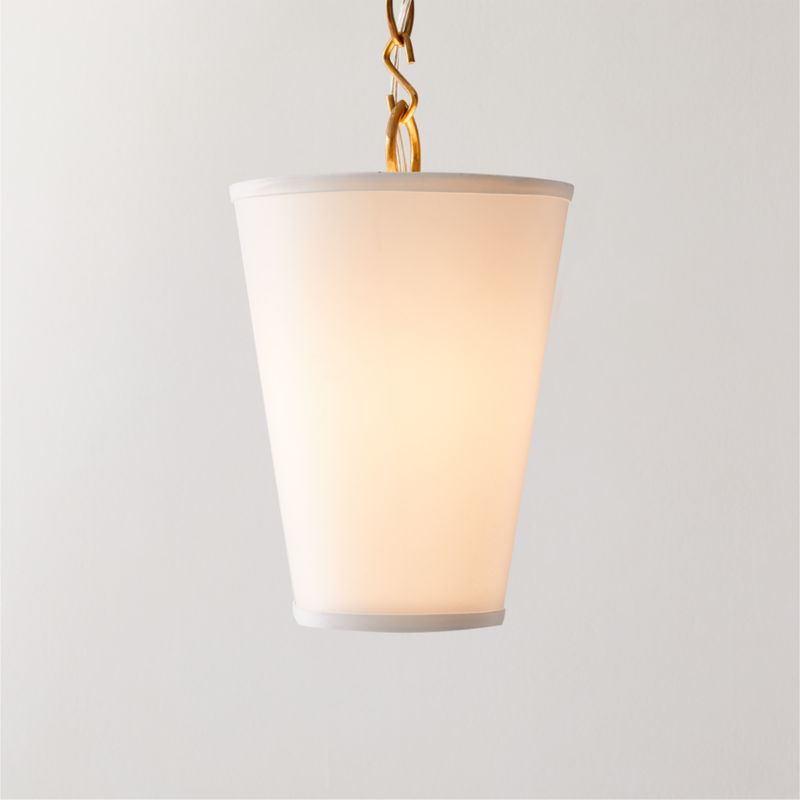 Pendant light by Kara Mann mixes textures within a distinctive silhouette. Custom-designed chain links support a classic satin shade that subtly reveals a diffuser. Each of the bronze-finish chain links is carved by hand of brass, which will develop a beautiful patina over time. CB2 exclusive.