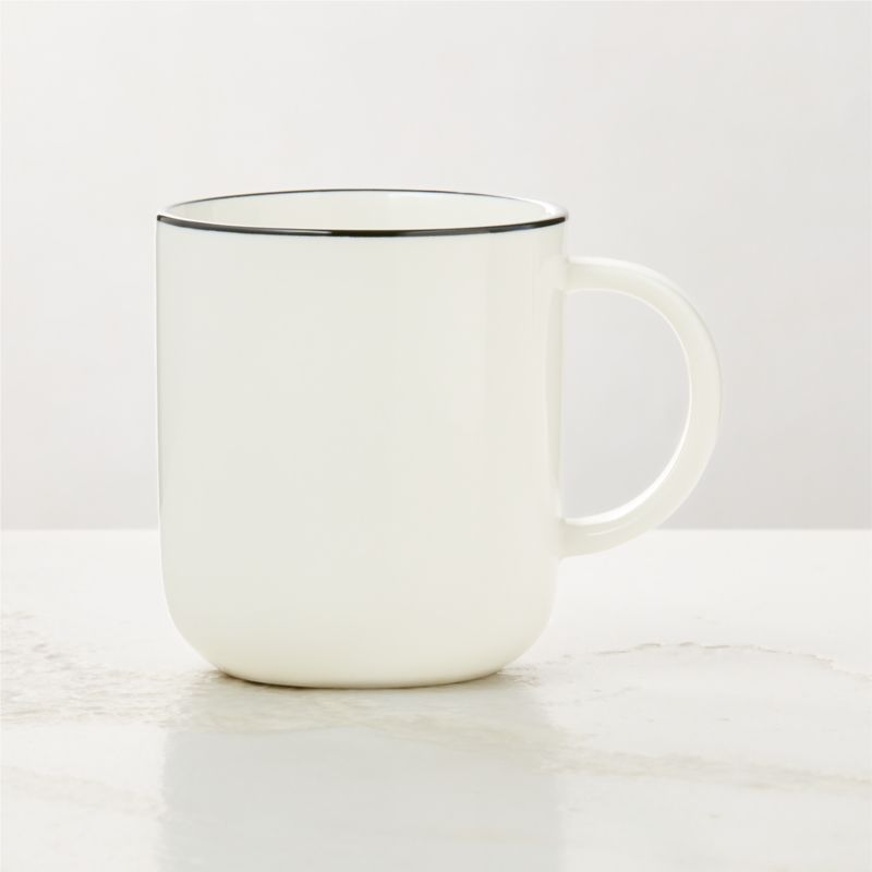 Handcrafted new bone china mug features a creamy white glaze with a fine black rim painted by hand. CB2 exclusive.