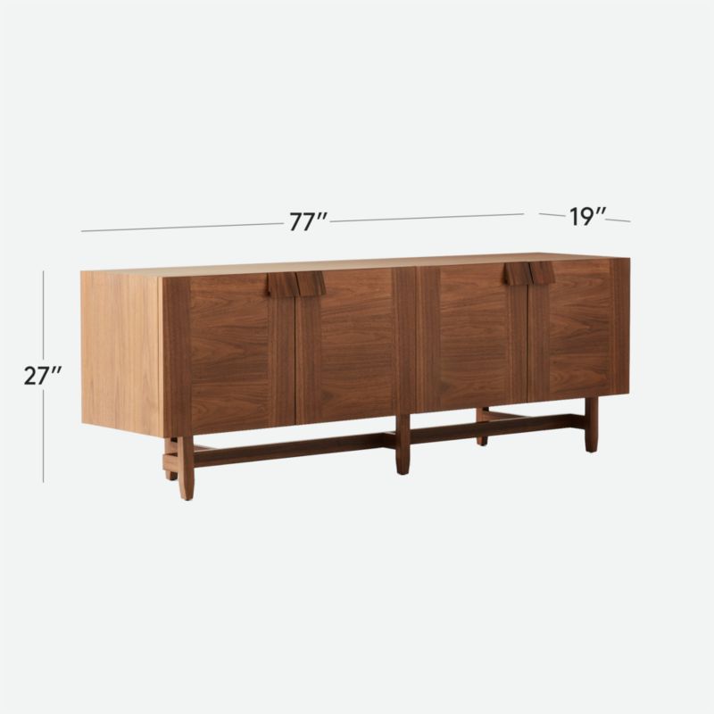 Handsome credenza by California design duo Lawson-Fenning plays up horizontal and vertical wood grain patterns to emphasize texture and dimension. Resting atop an airy base, the piece has integrated angular door handles. Four doors open to reveal generous storage, along with an adjustable shelf. CB2 exclusive.
