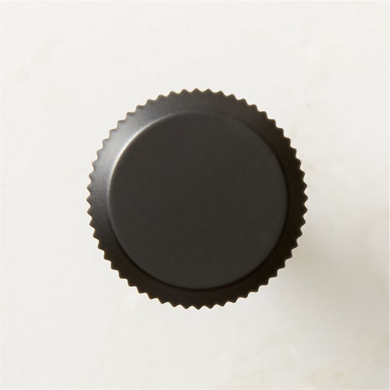 Crafted of solid brass, round black knob by Barcelona-based Mermelada Estudio is scored with bold lines for a modern sensibility. Pair with the Curveaux scored handle for a cohesive look. CB2 exclusive.