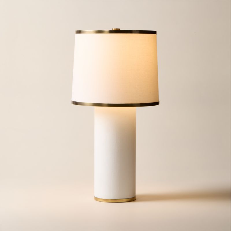 Adding rich color and a touch of texture, sleek table lamp by award-winning French design duo dach&zephir is covered in dark green linen with a matching shade. Complemented by an aged brass trim, the lamp provides soft, ambient light. CB2 exclusive.