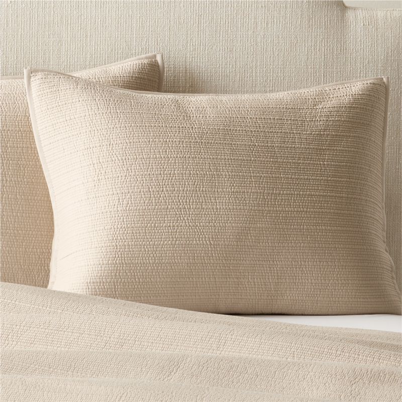 Crafted from organic cotton, taupe pillow shams have a luxurious, 210-thread-count sateen finish for a sumptuous feel. Narrow rows of channel stitching create a tailored, refined look. Light organic cotton fill imparts soft, breathable comfort year-round. CB2 exclusive.