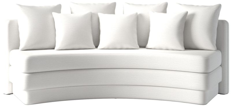 Designed for relaxed gatherings and everyday elegance, curved dining banquette by Studio ANANSI offers generous seating for four. Upholstered banquette balances sculptural form with inviting comfort. A thick bench-style seat cushion sits atop a fully upholstered plinth base, giving the appearance of a double-stacked silhouette for added visual weight. Finished with four oversized pillows and three smaller accent cushions, banquette pairs effortlessly with a round dining table. CB2 exclusive.