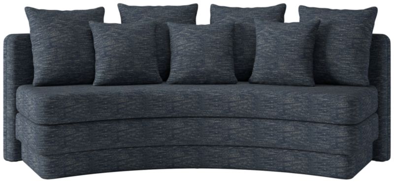 Designed for relaxed gatherings and everyday elegance, curved dining banquette by Studio ANANSI offers generous seating for four. Upholstered banquette balances sculptural form with inviting comfort. A thick bench-style seat cushion sits atop a fully upholstered plinth base, giving the appearance of a double-stacked silhouette for added visual weight. Finished with four oversized pillows and three smaller accent cushions, banquette pairs effortlessly with a round dining table. CB2 exclusive.