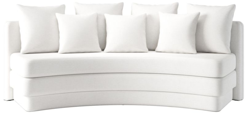 Designed for relaxed gatherings and everyday elegance, curved dining banquette by Studio ANANSI offers generous seating for four. Upholstered banquette balances sculptural form with inviting comfort. A thick bench-style seat cushion sits atop a fully upholstered plinth base, giving the appearance of a double-stacked silhouette for added visual weight. Finished with four oversized pillows and three smaller accent cushions, banquette pairs effortlessly with a round dining table. CB2 exclusive.