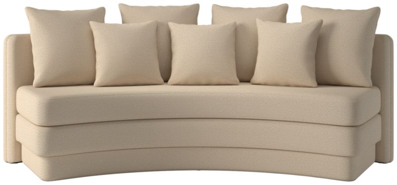 Designed for relaxed gatherings and everyday elegance, curved dining banquette by Studio ANANSI offers generous seating for four. Upholstered banquette balances sculptural form with inviting comfort. A thick bench-style seat cushion sits atop a fully upholstered plinth base, giving the appearance of a double-stacked silhouette for added visual weight. Finished with four oversized pillows and three smaller accent cushions, banquette pairs effortlessly with a round dining table. CB2 exclusive.