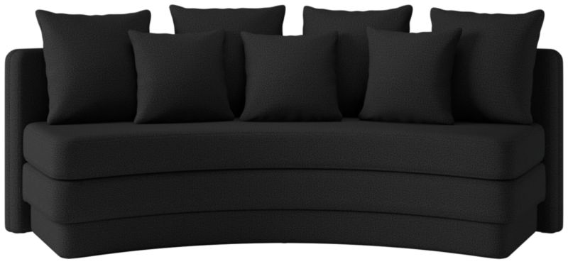 Designed for relaxed gatherings and everyday elegance, curved dining banquette by Studio ANANSI offers generous seating for four. Upholstered banquette balances sculptural form with inviting comfort. A thick bench-style seat cushion sits atop a fully upholstered plinth base, giving the appearance of a double-stacked silhouette for added visual weight. Finished with four oversized pillows and three smaller accent cushions, banquette pairs effortlessly with a round dining table. CB2 exclusive.