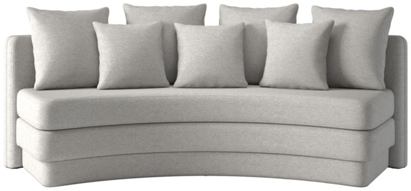 Designed for relaxed gatherings and everyday elegance, curved dining banquette by Studio ANANSI offers generous seating for four. Upholstered banquette balances sculptural form with inviting comfort. A thick bench-style seat cushion sits atop a fully upholstered plinth base, giving the appearance of a double-stacked silhouette for added visual weight. Finished with four oversized pillows and three smaller accent cushions, banquette pairs effortlessly with a round dining table. CB2 exclusive.