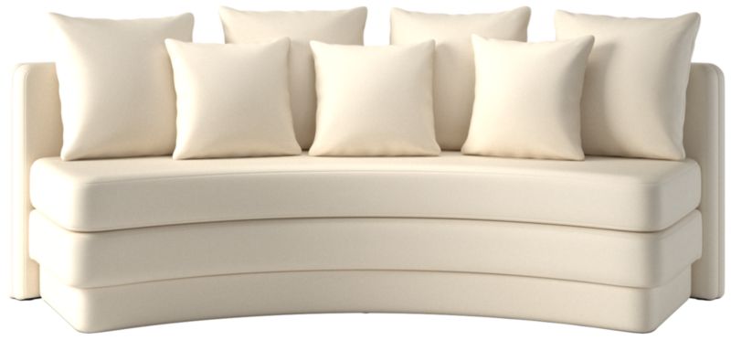 Designed for relaxed gatherings and everyday elegance, curved dining banquette by Studio ANANSI offers generous seating for four. Upholstered banquette balances sculptural form with inviting comfort. A thick bench-style seat cushion sits atop a fully upholstered plinth base, giving the appearance of a double-stacked silhouette for added visual weight. Finished with four oversized pillows and three smaller accent cushions, banquette pairs effortlessly with a round dining table. CB2 exclusive.