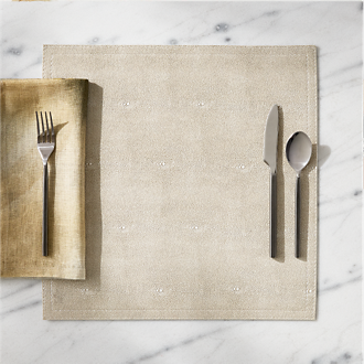 Hosting a fancy get together? Ready your dining table with modern and unique table linens. Elevate the evening by draping a table runner over its center. For a breezy daytime gathering, go for neutrals featuring geometric patterns. Then, take your basics up a notch with on-trend serveware and platters arranged along the fabric. For an evening soiree, swap out bright colors for something darker—think: black or grey textiles beneath flickering candlelight. Rather use table linens to show off your eclectic taste? Lay down a whimsical print to create an unexpected focal point, and tie the look together with neutral serving dishes and dinner plates. Define your place settings with coordinating napkins folded to house flatware or tugged through a simple metal napkin ring. For everyday dining, save your table from heat and mess with easy-to-clean placemats in faux leather or traditional vinyl. Or, choose metal placemats that double as oversized trivets.