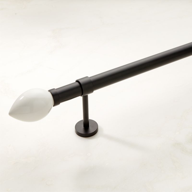 Designed by Jannis Ellenberger, curtain rod is crafted of stainless steel with a matte black finish. Design features slightly tapered white porcelain finials with a matte black trim. CB2 exclusive.