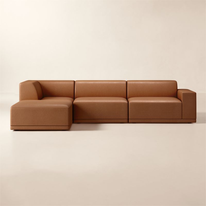 Hand-assembled in North Carolina, sectional sofa by Melbourne-based design studio VUUE is sophisticated in rich leather upholstery. Neat seat and back cushions sit upright, making it our go-to spot for lounging. Leather retains its inherent texture and graining, adding character to any piece. Each hide is unique and will age and soften over time. Customize the sectional layout to suit your individual space. CB2 exclusive.