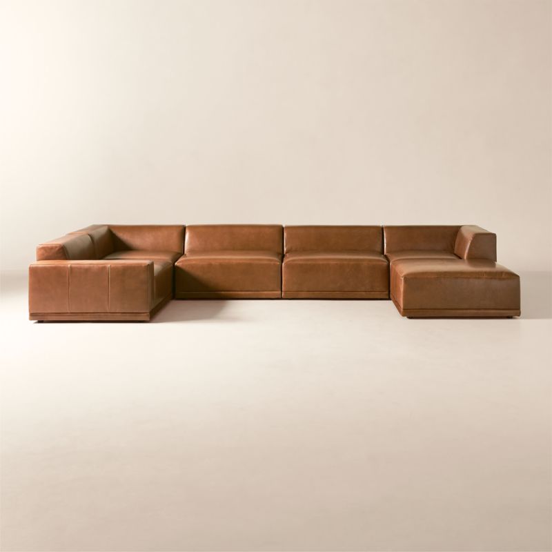 Deep, generously proportioned sectional sofa designed by VUUE is sophisticated in Moore & Giles full-grain leather upholstery. The oversized profile is perfect for lounging with family and friends without sacrificing style. Hand-selected for its inherent markings and characteristics, the leather upholstery is finished with layers of wax for a naturally worn-in aesthetic. Customize the sectional layout to suit your individual space. CB2 exclusive.