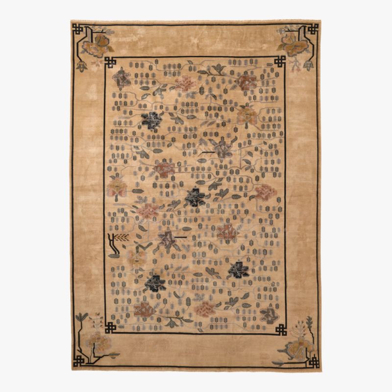 Designed by Kara Mann, low-pile area rug honors the craftsmanship of vintage Chinese Peking and Art Deco rugs, reimagined with contemporary elegance. At its center, a classic medallion is surrounded by intricate floral motifs, while geometric borders and stylized corner elements refine its aesthetic with a balance of tradition and modernity. Hand-knotted from a luxurious blend of New Zealand and European wool, the rug achieves its varying pile levels as artisans shear the wool by hand. A final process of distressing and washing creates the timeworn, vintage character. CB2 exclusive.
