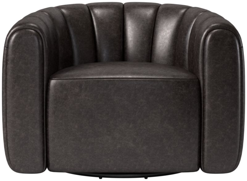 Upholstered swivel chair by Melbourne-based design studio VUUE evokes the elegance of an art deco piece. With its lush leather upholstery, the chair features deep channel tufting that softens the rounded profile. CB2 exclusive.