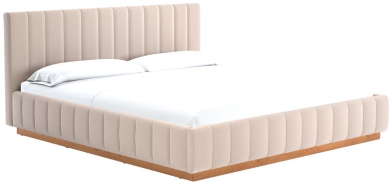 Designed by Mermelada Estudio, cushy channels of lush upholstery line the length of this finely tailored bed. Plinth oak wood base keeps a minimal profile finished in a subtle whitewash. A true statement piece. Learn about Mermelada Estudio on our blog. CB2 exclusive.
