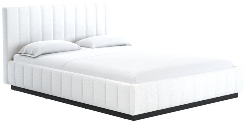 Designed by Mermelada Estudio, cushy channels of plush upholstery line the length of this finely tailored bed. Plinth oak wood base with a black finish keeps a minimal profile. A true statement piece. CB2 exclusive.