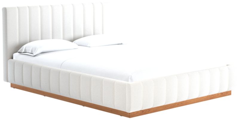 Designed by Mermelada Estudio, cushy channels of lush upholstery line the length of this finely tailored bed. Plinth oak wood base keeps a minimal profile finished in a subtle whitewash. A true statement piece. Learn about Mermelada Estudio on our blog. CB2 exclusive.