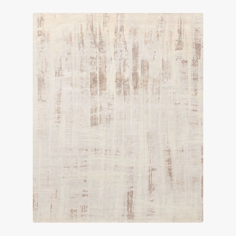 Designed in collaboration with House of Heras, area rug channels painterly abstraction through a lens of luxurious handcraft. Softly striated brushstrokes in warm neutrals and cool greys sweep across a surface, creating a layered, atmospheric composition. Each rug is hand-knotted using a premium blend of wool and viscose for a smooth, silky handfeel. Yarn-dyed for richness and depth, low-pile rug is finished with hand binding. Due to artisanal dyeing and knotting techniques, slight variations in color and scale make each piece beautifully one of a kind. CB2 exclusive.