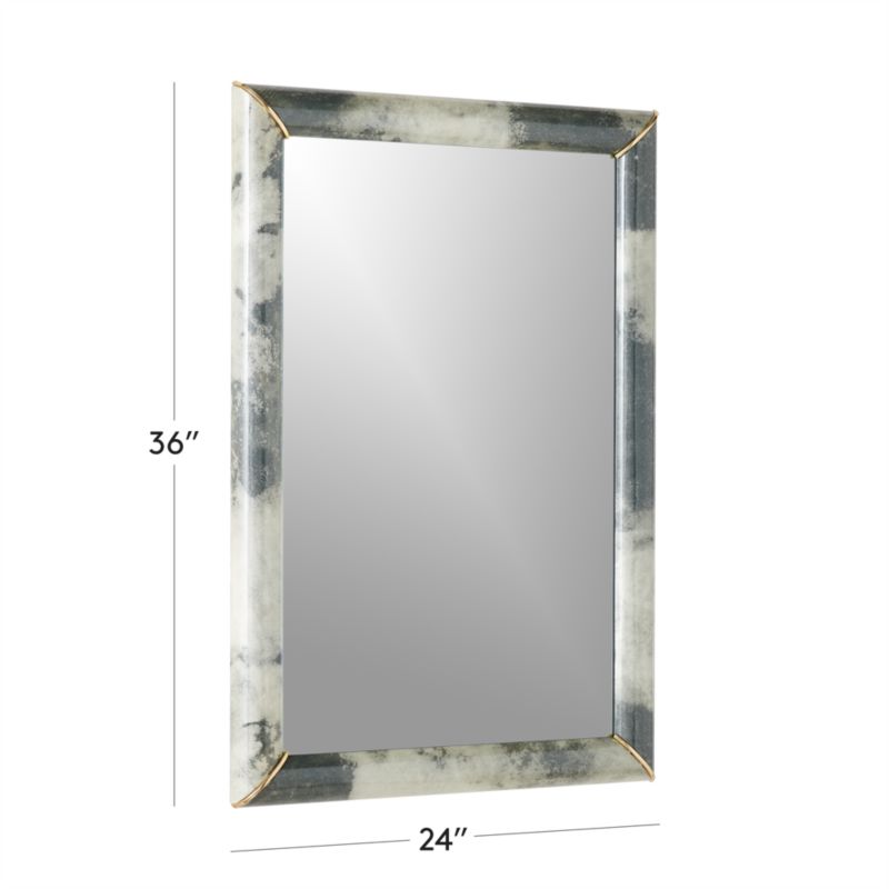 Blurring the line between design and art, generously sized wall mirror has a painterly feel. Each of its frame edges is daubed with gray paint colors, then swathed in fine vellum for a gauzy appearance. At the corners, brass accents slope inward to entice the eye. Due to the nature of the materials, each mirror will be unique. CB2 exclusive.