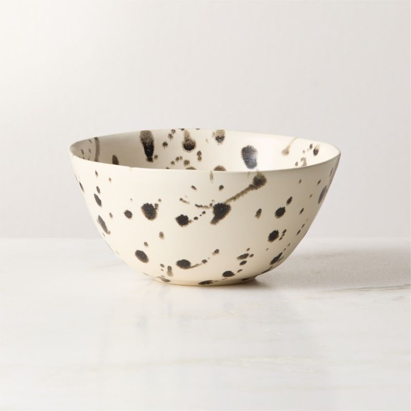 Hand-glazed in Portugal, stoneware soup bowl is inspired by abstract drip paintings. Skilled Portuguese artisans press each piece into a mold before coating the durable stoneware in a matte ivory reactive glaze. Then, they apply a dark glaze, creating drips that are unique to each piece. CB2 exclusive.