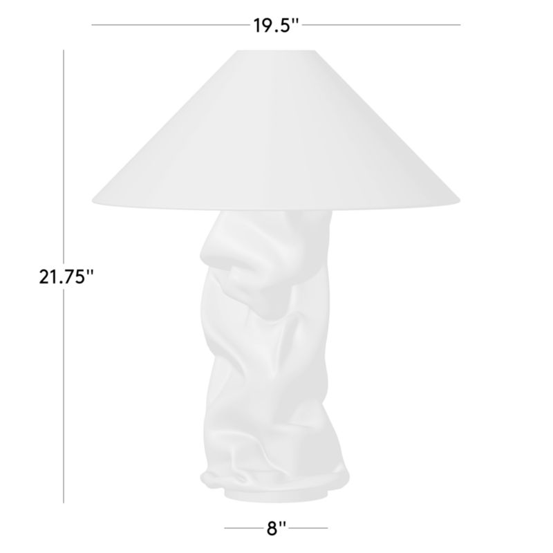 Stunning resin table lamp draws inspiration from the way silk transforms fluidly with its surroundings. Matte white resin gracefully drapes over itself with stainless steel accents at the bottom for an elegant touch. Topped with a black silk shade to cast a soft glow. CB2 exclusive.