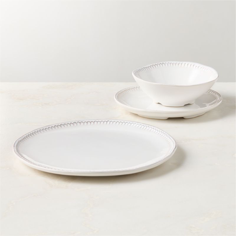 Italian white stoneware dinnerware sets casual and formal tables alike. Sourced from Italy, clay is modeled by skilled Italian ceramicists in Civita Castellana and embossed with a motif reminiscent of a chain. Finished with a creamy enamel glaze, the Iliana collection is one of a kind, with each piece reflecting the hand of the artisan. CB2 exclusive.