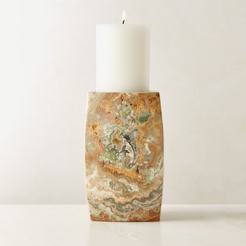 Large, minimalist pillar candle holder by Studio ANANSI exhibits clean curves and precise lines. Cut and shaped from highly active solid green travertine, each piece will display a unique variety of activity in tones of green, tan and white. Style it with the small Kashton candle holder to create a compelling scene. CB2 exclusive.
