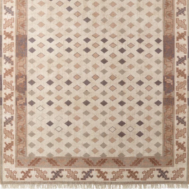 Knotted by hand with pure New Zealand wool, vintage-inspired performance area rug frames an allover diamond lattice pattern with graphic geometric borders. A soft, yarn-dyed palette of warm white and cool grey highlights the rug's vintage sensibility, enhanced by artisanal washing and subtle abrash for lived-in character. Each rug is crafted using time-honored knotting techniques, all in a performance textile designed for modern living. This handmade process ensures slight variations in color and scale that lend each rug a distinct, heirloom appeal. A medium pile and soft hand make this piece a tactile foundation for a variety of spaces from living rooms to bedrooms. CB2 exclusive.