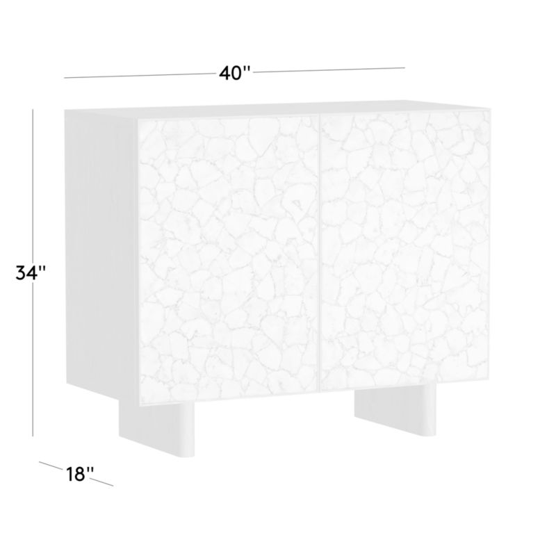 VUUE highlights the richness of natural materials. Cut scolecite door fronts create an abstract pattern full of texture and activity. Function not to be outdone by its beauty, the doors open to adjustable shelves that serve up storage for the entryway or bar. CB2 exclusive.
