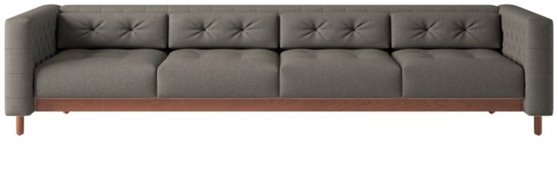 This sleek, low sofa was originally created by iconic Italian designer Gianfranco Frattini for the fashionable Restaurant St. Andrews in the heart of old Milan. Now, a modern classic returns with the same spirit of the original design, reimagined with room for four. Period-authentic details include hand-sewn button tufts on the interior sides and cushions, along with the inset walnut legs that are characteristic of the designer's signature style. CB2 exclusive.