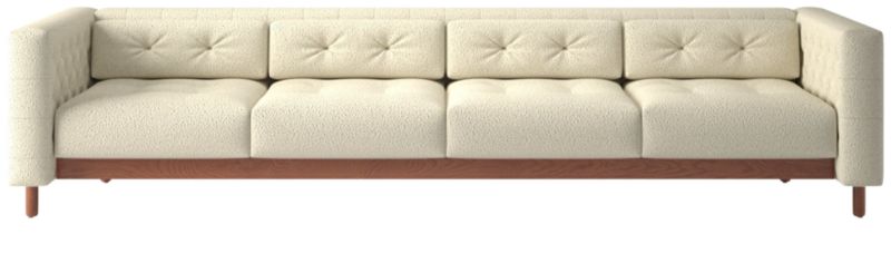 This sleek, low sofa was originally created by iconic Italian designer Gianfranco Frattini for the fashionable Restaurant St. Andrews in the heart of old Milan. Now, a modern classic returns with the same spirit of the original design, reimagined with room for four. Period-authentic details include hand-sewn button tufts on the interior sides and cushions, along with the inset walnut legs that are characteristic of the designer's signature style. CB2 exclusive.